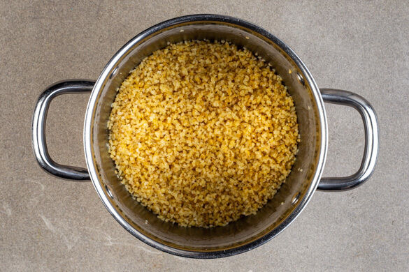 Den Bulgur in das kochende Wasser rühren und abgedeckt bei niedriger Hitze 5–7Min. sanft köcheln lassen, bis das Wasser aufgesaugt und der Bulgur gar ist. Noch ca. 5Min. ohne Hitzezufuhr ziehen lassen.
