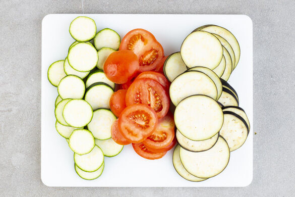 In einem kleinen Topf 300ml leicht gesalzenes Wasser für den Bulgur zum Kochen bringen. Die Aubergine, die Tomaten und die Zucchini in dünne Scheiben schneiden.
