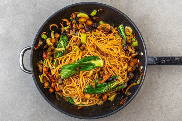 Die Pasta und die Auberginen in die Pfanne geben und 2–3Min. mitbraten. Die übrigen Lauchzwiebeln und die Pak-Choi-Blätter hinzugeben und mit der Sojasauce und 2EL hellem Essig ablöschen. Dann die Hoisinsauce und 2–3EL Pastawasser hinzugeben, bis alles gut vermengt ist.