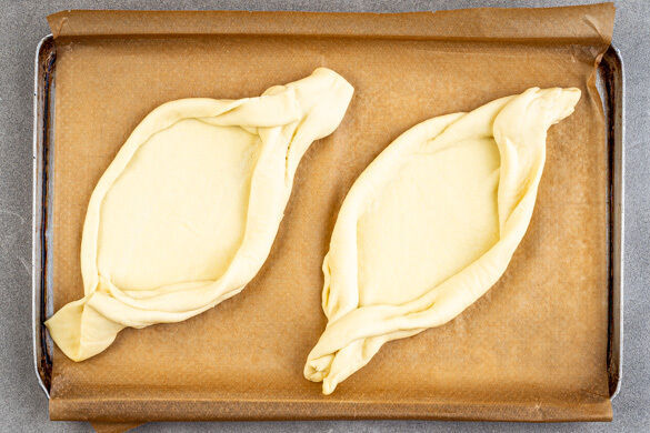 Den Teig mit dem Papier nach unten auf einem Backblech ausrollen und quer halbieren. Jeweils die Ränder nach oben falten, dann die Enden eindrehen und zu einer Schiffchenform zusammendrücken.