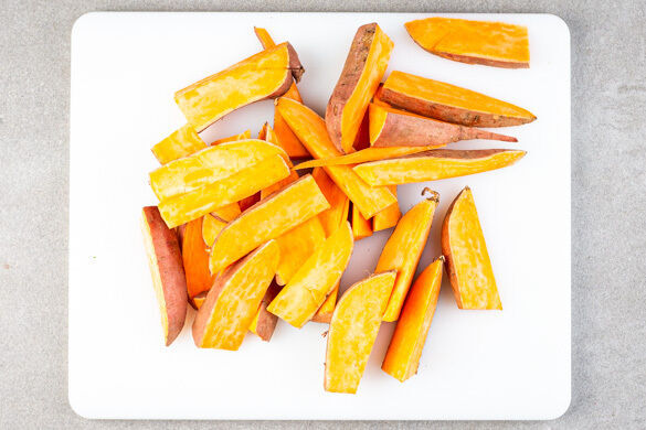 Den Backofen auf 230°C (210°C Umluft) vorheizen. Die Süßkartoffel samt Schale längs halbieren und in ca. 1cm dicke Spalten schneiden.