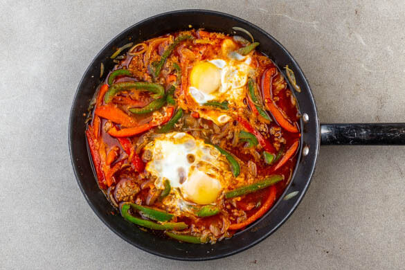 Shakshuka ist ein beliebtes Gericht in der nordafrikanischen und levantinischen Küche. Das Wort bedeutet in etwa „Mischung“. Das trifft es doch ganz gut, denn heute mischst du mageres Bio-Rindertatar mit Paprika und aromatischen Würzmitteln. Natürlich dürfen die pochierten Eier und die Petersilie als Garnitur nicht fehlen. Die bunte Pfanne kann sich wirklich sehen und schmecken lassen. Guten Appetit!