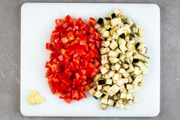 Die Aubergine und die Tomate in ca. 1cm große Würfel schneiden, dann mit je 1 kräftigen Prise Salz und Pfeffer würzen. Den Knoblauch schälen und fein würfeln.