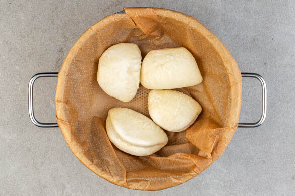 Einen großen Topf mit Wasser bis knapp unter den Dämpfeinsatz füllen und das Wasser zum Kochen bringen. Tipp: Wer keinen Dämpfeinsatz hat, kann auch ein passendes Sieb verwenden. Die Hefebrötchen in den mit Backpapier ausgelegten Dämpfeinsatz geben und 5–6Min. abgedeckt dämpfen, bis sie fluffig und heiß sind. Ggf. in mehreren Durchgängen arbeiten. Herausnehmen und abkühlen lassen.