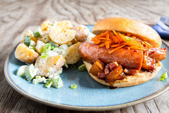 Wer hätte gewusst, dass der weltberühmte Hotdog bereits 1874 in Frankfurt erfunden wurde? Erst Jahre später verkaufte ein deutscher Migrant in Brooklyn die Frankfurter Wurst im Brötchenmantel – und wurde damit zum Millionär! Goldrichtig liegst auch du heute mit unserer hawaiianischen Variante: Zum knusprigen Speck gesellen sich deftige Rindswurst und fruchtige Ananas, die in würzig-süßer Teriyakisauce gebraten werden. Aloha!