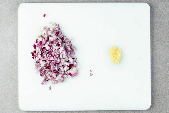 Die Zwiebeln schälen, halbieren und fein würfeln. Den Knoblauch schälen und ebenfalls fein würfeln.