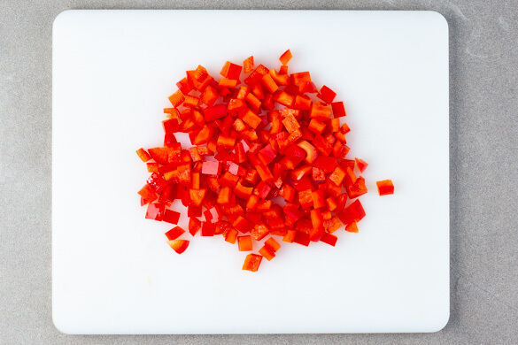 Die Paprika vierteln, entkernen und in ca. 1cm große Würfel schneiden.
