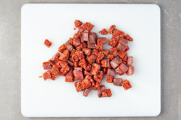 Die Würste längs vierteln und in 1–2cm große Würfel schneiden.