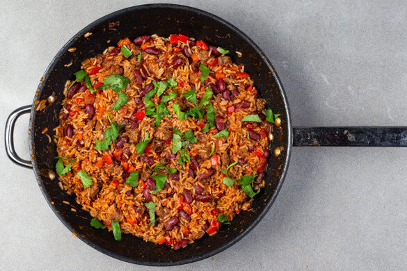 Vom (kaum vorhandenen) Abwasch her geht doch nichts über One-Pot-Gerichte. Dass sie zudem oft mit einem deftig-herzhaften Wohlfühlgeschmack aufwarten, ist dabei nur noch erfreulicher. Somit spricht auch alles für unsere heutige Geschirr-spar-lecker-Kreation, die saftige Bio-Rindswurst, Paprika, Bohnen und Reis einträchtig vereint. Für den kräftig roten Gesamteindruck sorgen Tomaten, für grüne Abwechslung Koriander. Top!