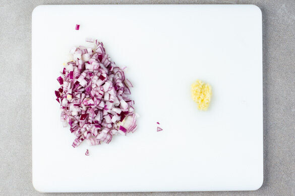Die Zwiebel schälen, halbieren und fein würfeln. Den Knoblauch schälen und ebenfalls fein würfeln.
