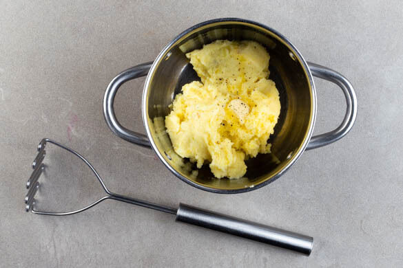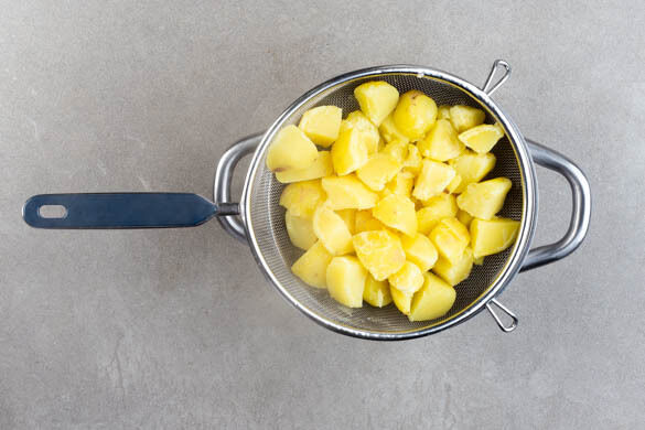In einem mittelgroßen Topf ausreichend gesalzenes Wasser für die Kartoffeln zum Kochen bringen. Die Kartoffeln schälen und in 2–3cm große Stücke schneiden, dann in das kochende Wasser geben und in 14–16Min. gar kochen. In ein Sieb abgießen, zurück in den Topf geben und abgedeckt warm halten.