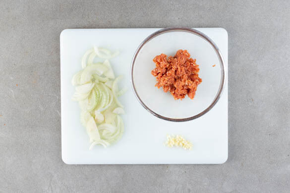 Die Zwiebeln schälen, halbieren und in dünne Spalten schneiden. Den Knoblauch schälen und fein würfeln. Die Haut von den Würsten abziehen und die Würste mit den Händen zerkleinern.
