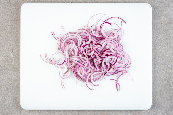 Die Zwiebeln schälen, halbieren und in feine Streifen schneiden.
