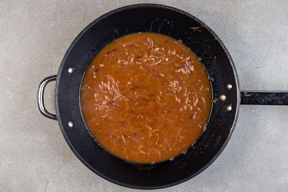 Die Zwiebeln in einer mittelgroßen Pfanne mit 1EL Olivenöl, 1TL Zucker und ½TL Salz bei starker Hitze 5–6Min. kräftig anbräunen. 1TL Mehl unterrühren, mit 250ml Wasser ablöschen und die Sauce bei mittlerer Hitze 3–4Min. einköcheln lassen. Tipp: Wer mag, kann für noch mehr Geschmack 100ml Rotwein und 150ml Wasser verwenden.
