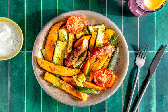Mit süßlich-herzhaft können wir doch alle etwas anfangen. Und so leicht wie heute machen wir es uns besonders gern: Nach ein bisschen überschaubarer Schnippelei wandern Süßkartoffeln, Zucchini, Tomaten, Karotten und die saftigen Würste in den Ofen und machen sich eine gute Zeit in der Wärme. Wir bereiten inzwischen den Saure-Sahne-Dill-Dip vor, der dann sogleich fertiggestellt und zum festlichen Ofenschmaus gereicht wird. Top!