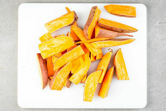 Den Backofen auf 230°C (210°C Umluft) vorheizen. Die Süßkartoffeln samt Schale längs halbieren und in ca. 1cm dicke Spalten schneiden.