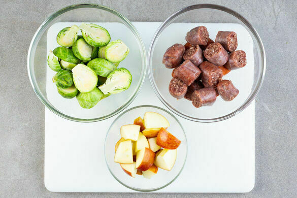 Nebenher die Rosenkohlröschen halbieren. Die Äpfel vierteln, entkernen und grob würfeln. Die Würste in ca. 3cm breite Scheiben schneiden.