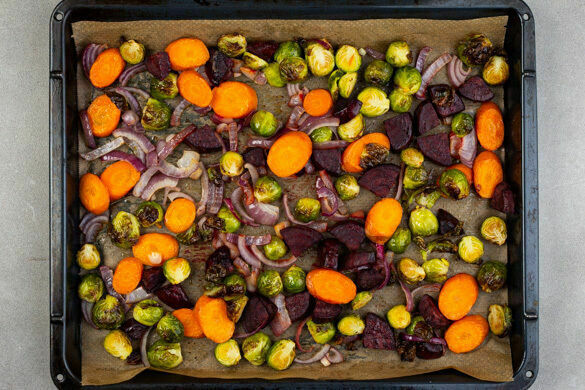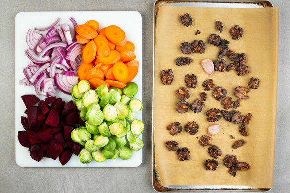 Den Backofen auf 220°C (200°C Umluft) vorheizen. Den ungeschälten Knoblauch und die Walnüsse auf einem mit Backpapier ausgelegten Backblech für ca. 10Min. in den noch vorheizenden Ofen geben. Die Rote Bete und die Zwiebeln schälen und in ca. 2cm breite Spalten schneiden. Die Karotten ggf. schälen und schräg in dünne Scheiben schneiden. Größere Rosenkohlröschen halbieren.