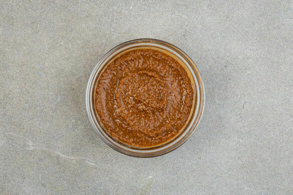 Die Walnüsse grob hacken. Den Knoblauch schälen und mit ¾ der Walnüsse, 2EL Ahornsirup, 2EL Olivenöl und 1EL Balsamicoessig in einem hohen Gefäß mit einem Stabmixer grob pürieren. Anschließend 100ml Wasser hinzufügen und alles möglichst cremig pürieren. Die Sauce nach Geschmack mit mehr Ahornsirup, Balsamicoessig und Salz verfeinern.
