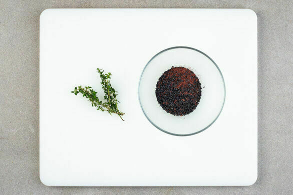 2–3EL Zitronenthymian von den Stängeln zupfen und mit dem Sesam vermengen.