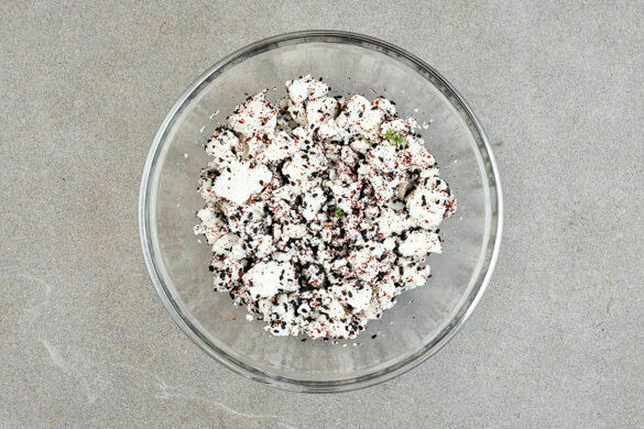Den Feta mit den Fingern oder einer Gabel zerkrümeln und mit den Gewürzen vermengen.
