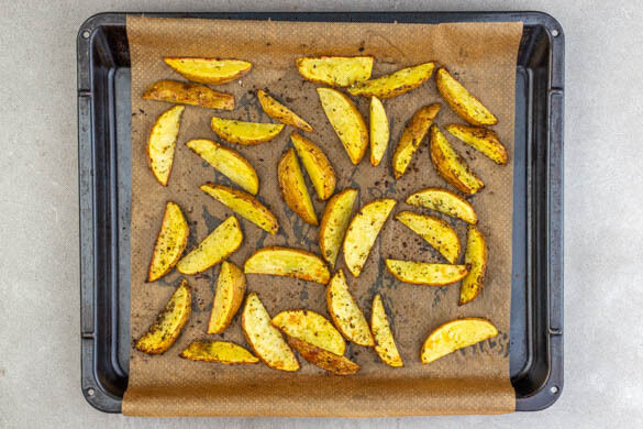 Die Kartoffeln samt Schale in pommesartige Spalten schneiden. Die Kartoffeln auf einem mit Backpapier ausgelegten Backblech mit der Gewürzmischung, 2EL Olivenöl sowie ½TL Salz vermengen und über den Paprika 20–23Min. im Ofen backen. Die Paprika nach ca. 10Min. Backzeit der Kartoffeln aus dem Ofen nehmen.