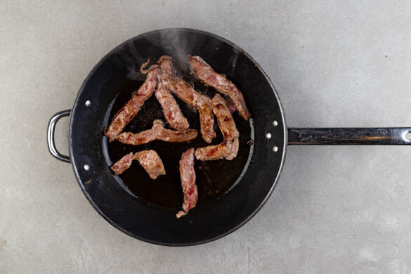 Die gebratenen Zwiebeln aus der Pfanne nehmen und beiseitestellen. Die Pfanne erneut stark erhitzen. Das Fleisch trocken tupfen, mit 2TL Pflanzenöl in die heiße Pfanne geben und ca. 3Min. scharf anbraten.