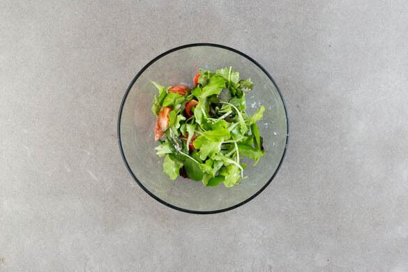 Die Tomaten in Spalten schneiden. 2TL Mayonnaise und 2TL hellen Essig mit je 1 kräftigen Prise Salz und Pfeffer zu einem Dressing verrühren.
