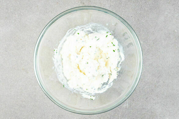 Den gerösteten Knoblauch (Vorsicht, heiß!) durch eine Knoblauchpresse drücken und mit der sauren Sahne, dem geschnittenen Dill und 2EL Mayonnaise verrühren. Mit Salz und Pfeffer abschmecken.