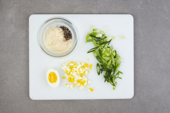 Das gekochte Ei halbieren und fein würfeln. Die Lauchzwiebel schräg in feine Ringe schneiden. Die Mayonnaise mit den Lauchzwiebeln, dem Senf, 2–3EL Wasser, 1–2TL Essig sowie Salz und Pfeffer verrühren, dann das gehackte Ei vorsichtig unterheben.