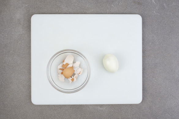 In einem kleinen Topf ausreichend Wasser für 2 Eier zum Kochen bringen. Sobald das Wasser kocht, 2 Eier hineingeben und in ca. 8Min. hart kochen. Die restlichen Eier nicht mitkochen, sie werden später noch benötigt. Die gekochten Eier mit kaltem Wasser abschrecken, kurz abkühlen lassen und schälen.