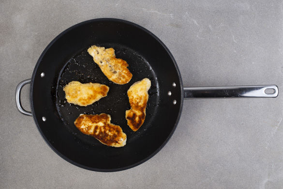 Das Fleisch trocken tupfen, schräg in je ca. 4 dünne Schnitzel schneiden und mit Salz und Pfeffer würzen. Die restlichen Eier mit einer Gabel verquirlen. Die Schnitzel nacheinander in etwas Mehl wenden, durch die verquirlten Eier ziehen und in den Semmelbröseln wenden, bis sie gut bedeckt sind. Die Panade leicht andrücken.