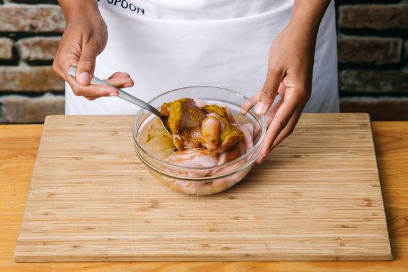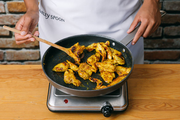 Den Backofen auf 180°C Umluft (200°C Ober-/Unterhitze) vorheizen. Das Fleisch mit etwas Küchenkrepp trocken tupfen und in ca. 1cm dicke Scheiben schneiden. Mit der Teriyakisauce und dem Currypulver vermengen und beiseitestellen.