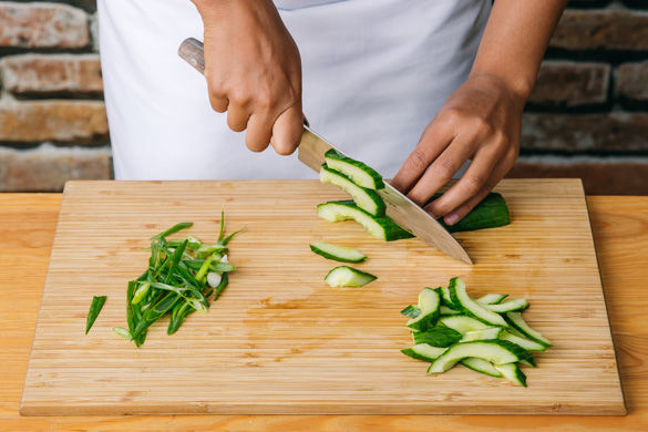 Die Lauchzwiebeln schräg in feine Ringe schneiden. Die Gurke längs vierteln und schräg in ca. 1cm breite Streifen schneiden.
