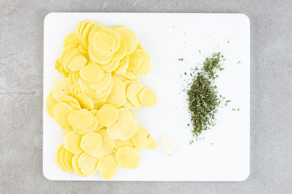 Den Backofen auf 220°C Umluft (240°C Ober-/Unterhitze) vorheizen. Die Kartoffeln schälen und in ca. 0,5cm dünne Scheiben schneiden. Die Thymianblätter abstreifen und fein hacken. Die Rosmarinnadeln abzupfen und grob schneiden. Den Knoblauch schälen und mit einem Messer flach zerdrücken.