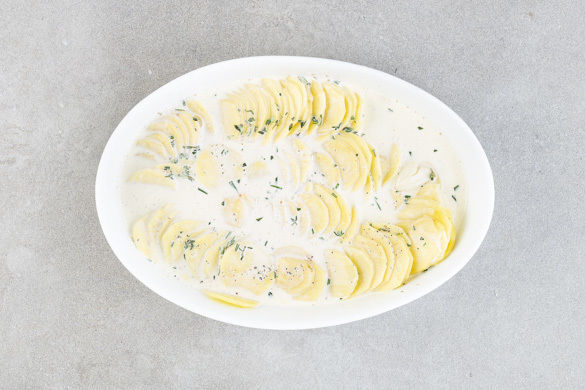 Die Kartoffelscheiben gleichmäßig in eine Auflaufform schichten, mit der Sahnesauce begießen und im Ofen 25–30Min. goldbraun backen. Tipp: Das Gratin ist fertig, wenn man mit einem Spieß leicht durch die Kartoffeln stechen kann.