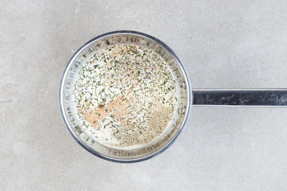 Die Sahne mit den Kräutern und dem Knoblauch in einem kleinen Topf bei mittlerer Hitze einmal aufkochen lassen, dann die Hitze reduzieren und die Sahne 4–5Min. sanft köcheln lassen. Mit Muskatnuss nach Geschmack sowie Salz und Pfeffer würzen. Tipp: Die Sauce sollte sehr intensiv, fast zu salzig schmecken.