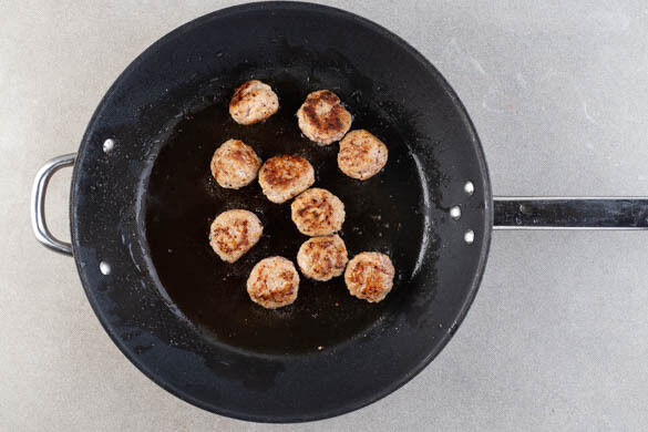 Das Hackfleisch, die Zwiebelwürfel und ca. ⅔ des Ingwers mit je 1 Prise Salz und Pfeffer gut verkneten. Aus der Masse 10–12 Hackbällchen formen und diese in einer großen Pfanne mit 1EL Olivenöl bei mittlerer Hitze 4–5Min. rundum anbraten.