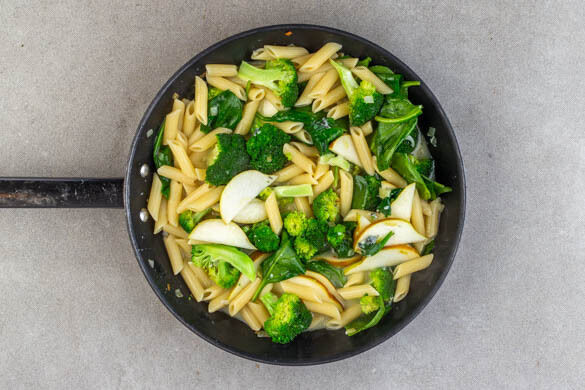 Den Brokkoli und die Zwiebeln in der Pfanne mit 1EL Olivenöl bei mittlerer Hitze 2–3Min. anschwitzen. ½EL Mehl unterrühren, dann mit 200ml Pastawasser ablöschen und ca. 1Min. köcheln lassen. Den Käse in die Pfanne bröseln, unterrühren und die Sauce noch kurz weiter köcheln lassen, bis der Käse geschmolzen ist.