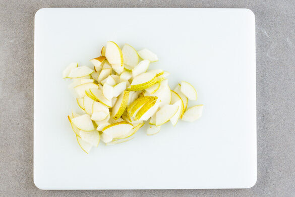 Den Backofen auf 190°C (170°C Umluft) vorheizen. In einem mittelgroßen Topf ausreichend gesalzenes Wasser für die Pasta zum Kochen bringen. Den Brokkoli samt Strunk in mundgerechte Stücke schneiden. Die Zwiebel schälen, halbieren und fein würfeln. Die Birne vierteln, entkernen und in ca. 0,5cm dünne Scheiben schneiden.