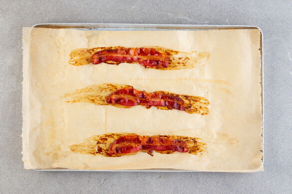 Den Speck auf ein mit Backpapier ausgelegtes Backblech geben und 10–12Min. im Ofen rösten, bis er schön kross ist.