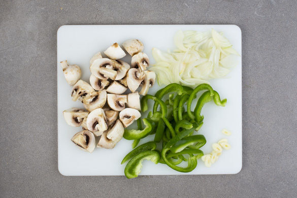 In einem kleinen Topf 300ml leicht gesalzenes Wasser für den Reis zum Kochen bringen. Die Champignons ggf. säubern und je nach Größe halbieren oder vierteln. Die Paprika vierteln, entkernen und in dünne Streifen schneiden. Die Zwiebel schälen, halbieren und in feine Streifen schneiden. Den Knoblauch schälen und in feine Scheibchen schneiden.