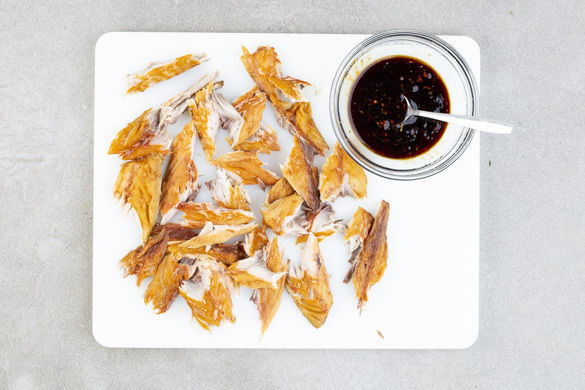 Die Makrelenhaut entfernen und die Makrele in kleine Stücke zupfen. Die Teriyakisauce mit dem Limettensaft und der 1/2 des Ingwers verrühren.