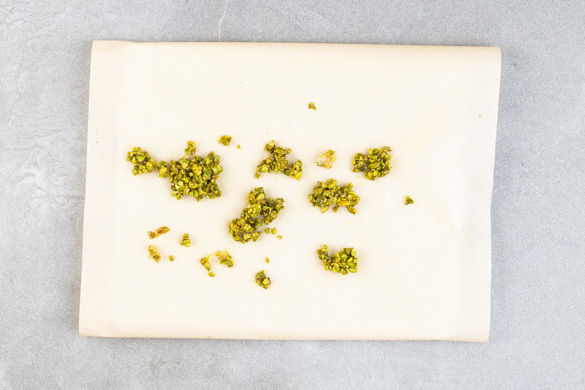 Die Pistazien grob hacken. In einer kleinen Pfanne bei geringer Hitze 1EL Zucker schmelzen und die Pistazien darin ca. 30Sek. karamellisieren. Anschließend auf einem Stück Backpapier verteilen und auskühlen lassen, dann grob hacken.
