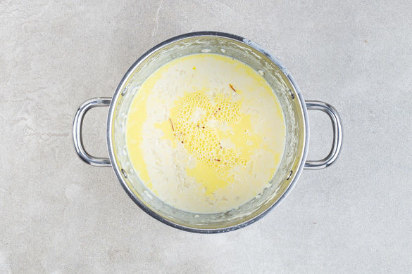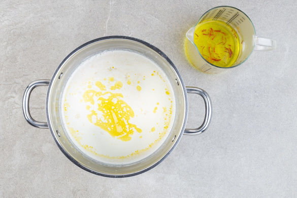Den Reis mit der Milch, 1EL Butter und 1–2EL Zucker in einem mittelgroßen Topf verrühren. Bei mittlerer Hitze unter ständigem Rühren zum Kochen bringen. Den Safran in 250ml heißem Wasser auflösen.