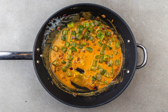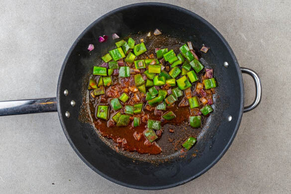 Die ½ des Brühgewürzes, 100ml Wasser und die restliche Gewürzmischung in die Pfanne geben und einmal aufkochen lassen, dann bei niedriger Hitze unter gelegentlichem Rühren 6–8Min. köcheln lassen.