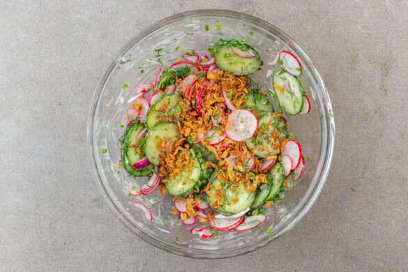 dazu Gurken-Radieschen-Salat mit Röstzwiebeln