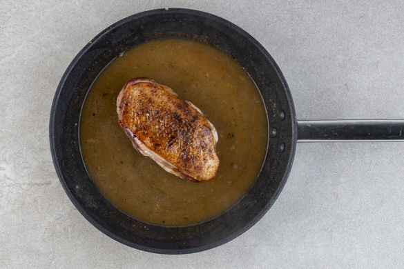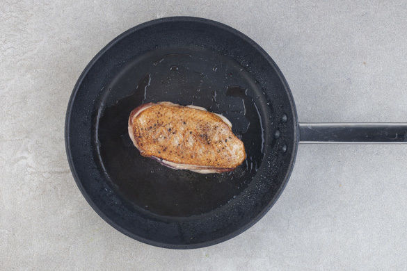 Das Fleisch mit etwas Küchenkrepp trocken tupfen und mit Salz und Pfeffer würzen. Die Hautseite vorsichtig mit einem scharfen Messer einschneiden und das Fleisch auf der Hautseite in einer mittelgroßen ofenfesten Pfanne mit 1–2EL Olivenöl 1–2Min. scharf anbraten, dann wenden und noch 1Min. braten. Auf einem Teller beiseitestellen.