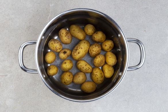 Den Backofen auf 200°C Umluft (220°C Ober-/Unterhitze) vorheizen. Die Kartoffeln in einem mittelgroßen Topf mit kaltem, leicht gesalzenem Wasser bedecken. Das Wasser bei starker Hitze zum Kochen bringen, dann die Hitze reduzieren und die Kartoffeln ca. 10Min. köcheln lassen.