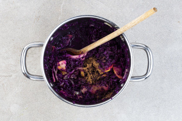 In einem weiteren mittleren Topf die Apfelscheiben und die Zwiebeln mit 1–2EL Butter bei mittlerer Hitze 2–3Min. anbraten. Den Rotkohl dazugeben und 200ml Brühe angießen. Abgedeckt 15Min. köcheln lassen, dann noch ca. 5Min. ohne Deckel die Flüssigkeit fast vollständig verdampfen lassen. Mit der Gewürzmischung nach Geschmack, 1 Prise Zucker sowie Salz und Pfeffer würzen.